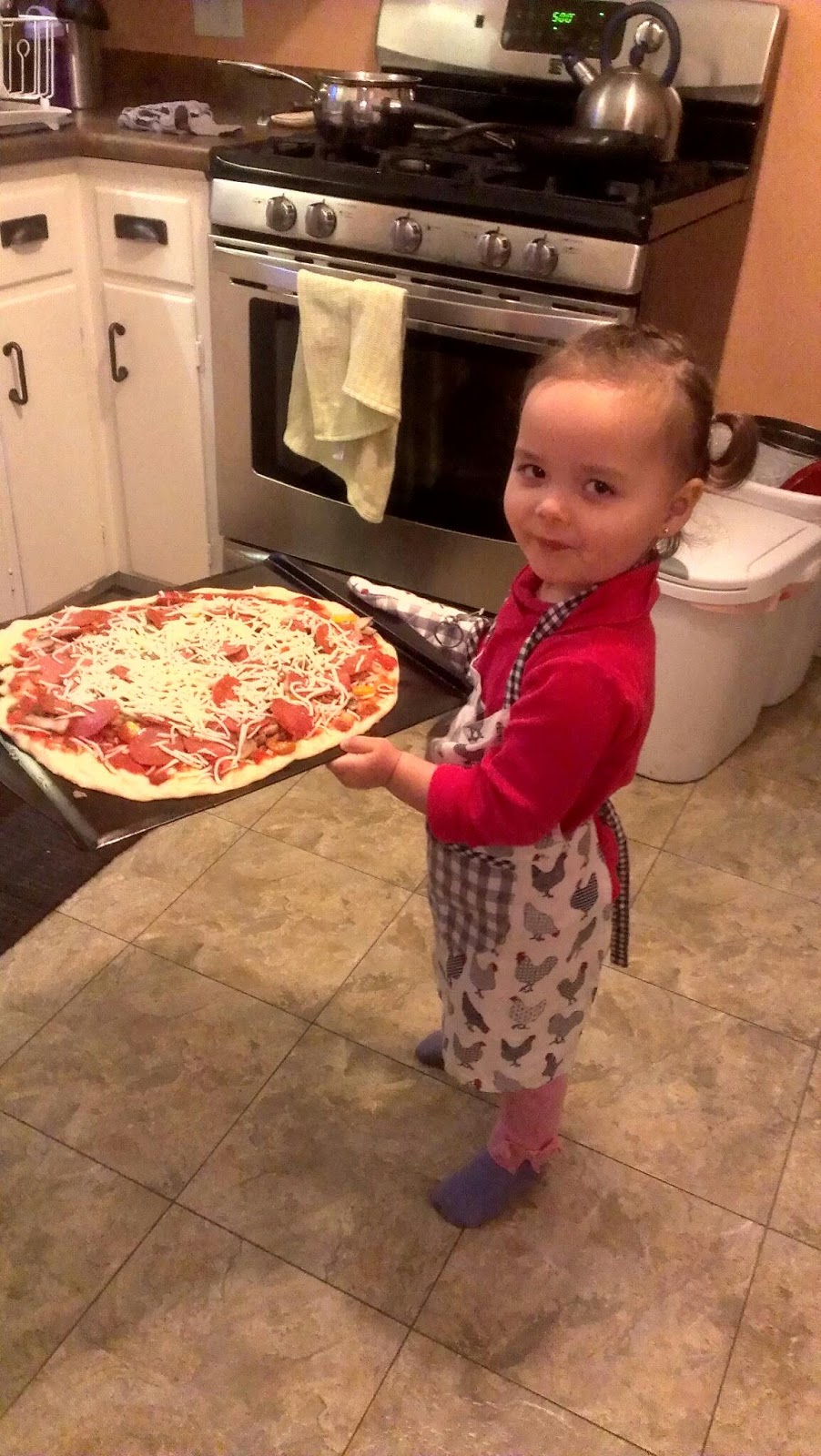 It has been our tradition to make pizzas every Friday nights. Emma has become pretty good at helping Cameron prepare them; she can extend the dough, arrange the pepperoni and sprinkle the cheese. She's also pretty good at eating it!